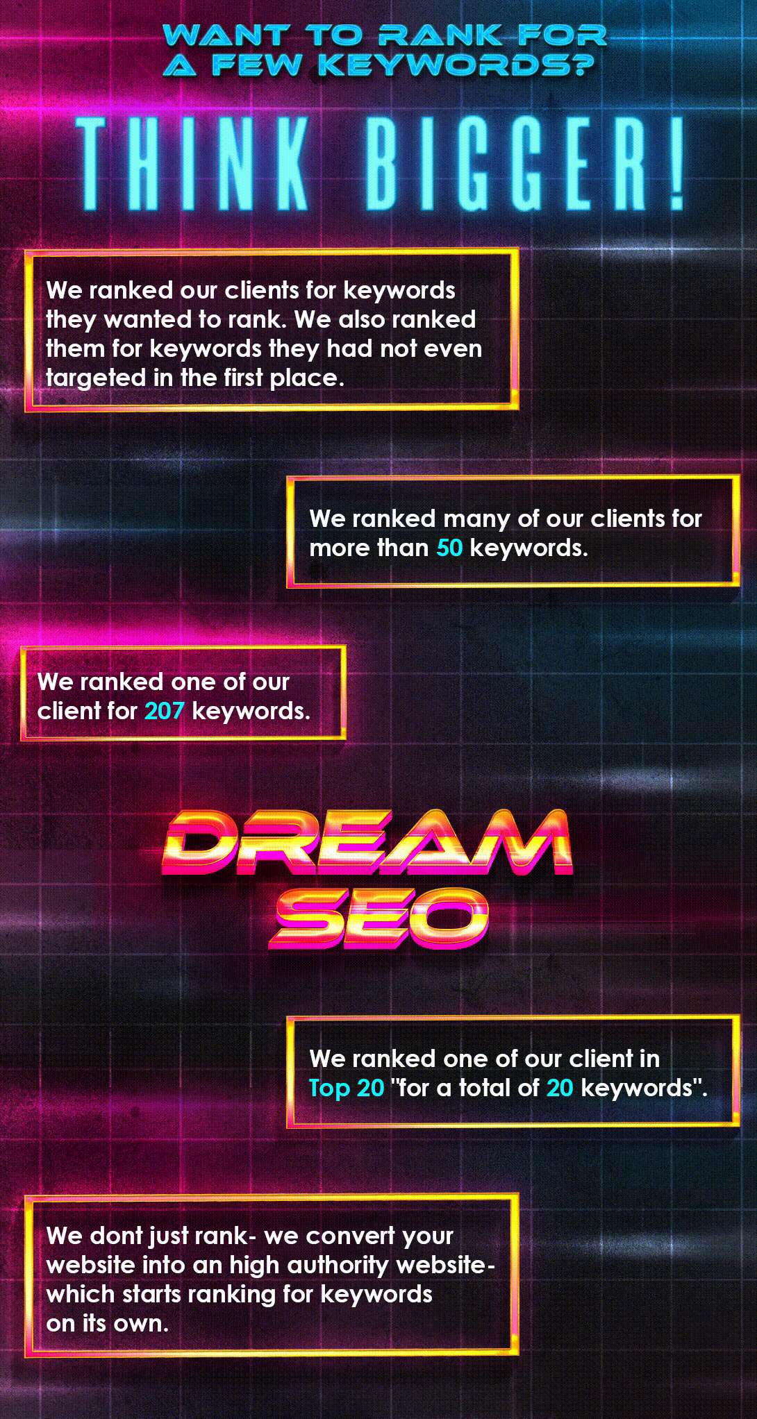 We dont just rank- we convert your website in an authority website- which starts ranking for keywords on its own.